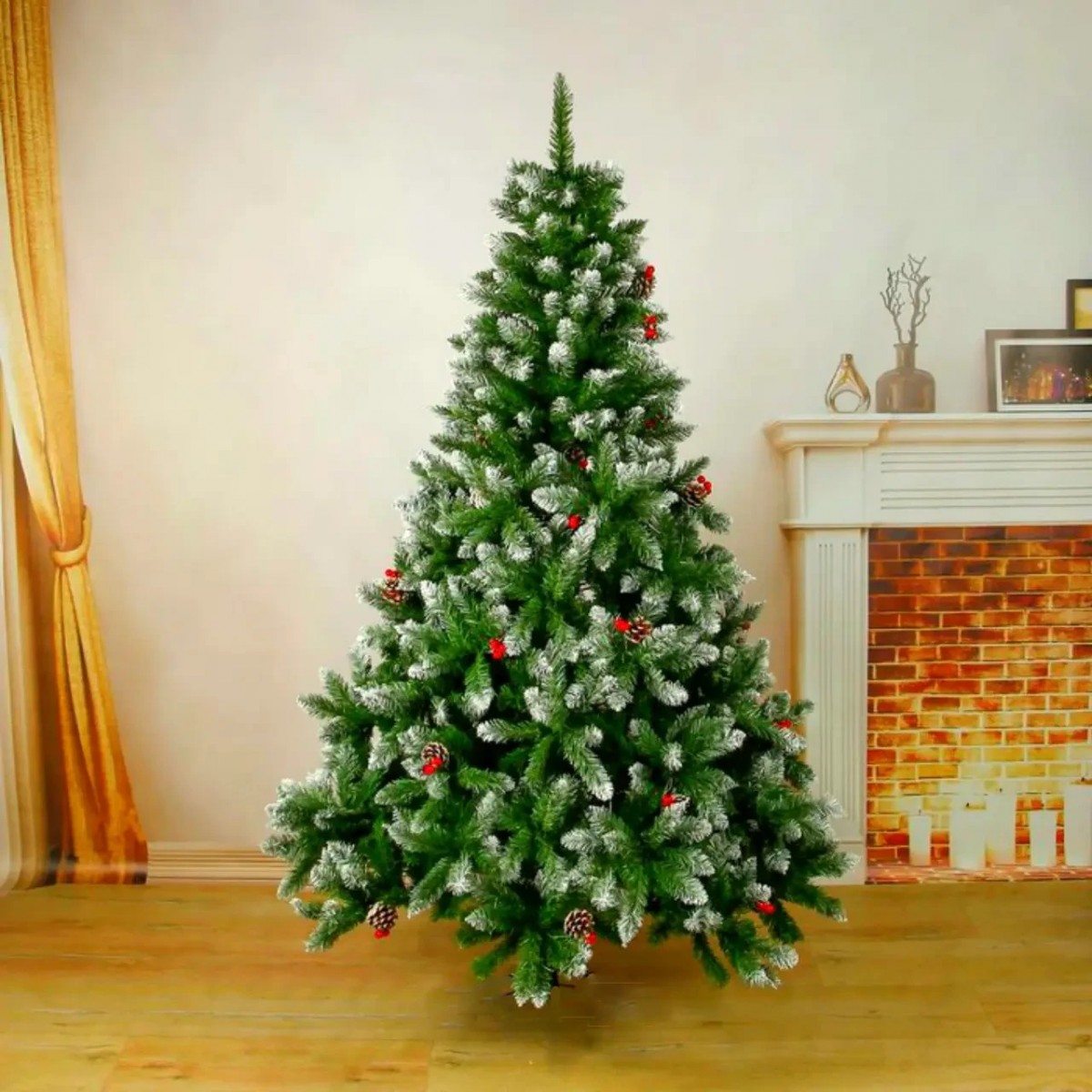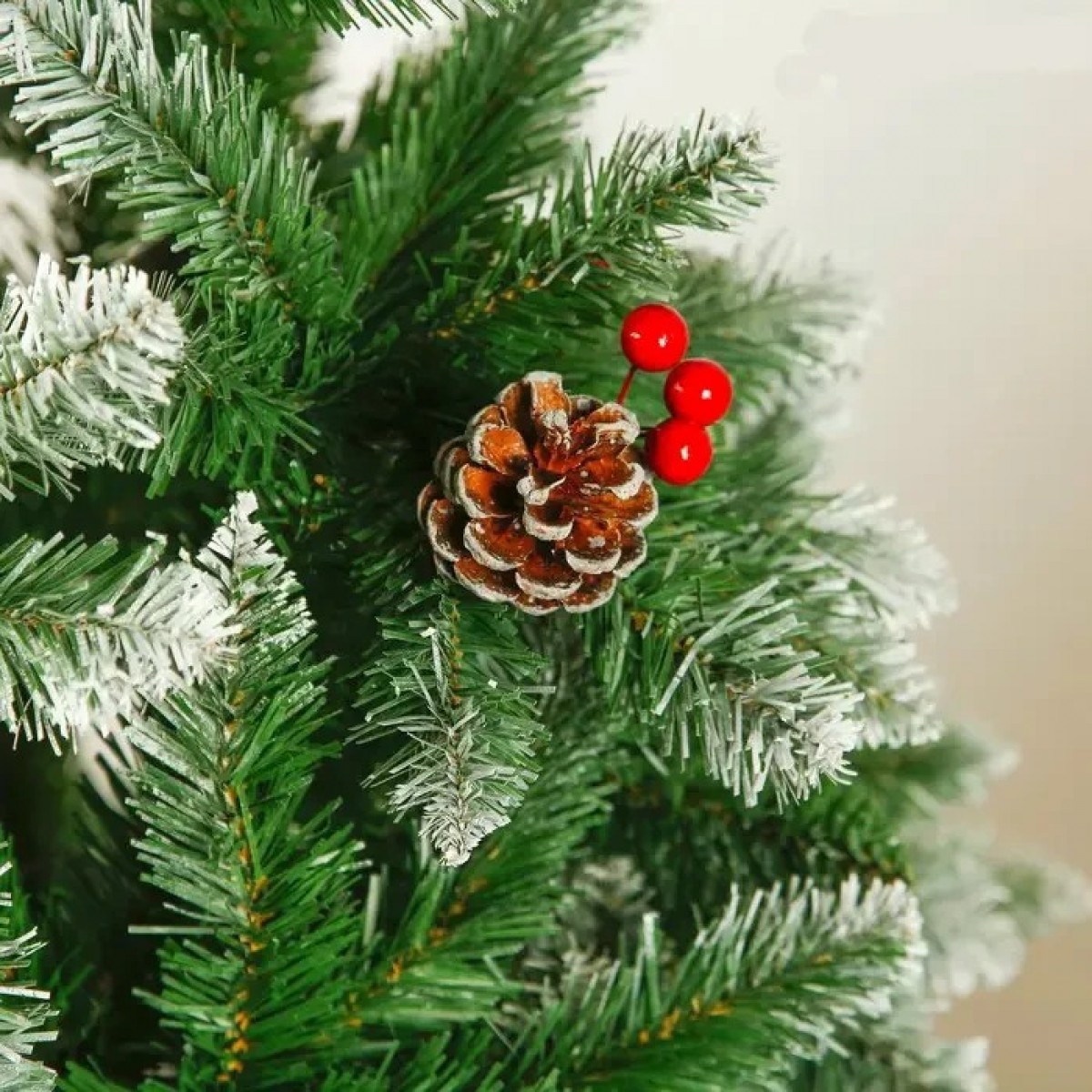 Пышная и очень праздничная искусственная новогодняя ёлка с ягодами калины, натуральными шишками и белыми заснеженными кончиками создаёт атмосферу уюта и зимней сказки. Сочетание яркой зелени, снежного эффекта и красных ягод делает ёлку выразительной даже без дополнительных украшений.