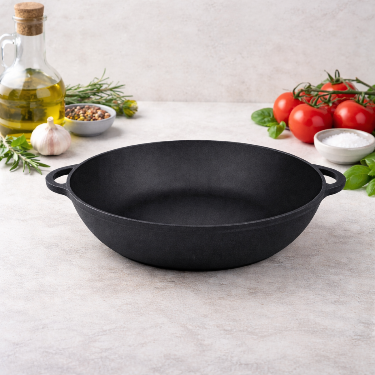 Диаметр (по крышке) - 320 мм, высота бортика - 60 мм. Вес сковороды - 3,3 кг. Диаметр ровной поверхности дна (с внешней стороны) ― 235 мм.